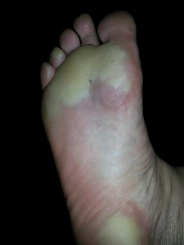 This is my foot. This is my foot on Sorafenib. This is called hand foot syndrome. Toxicity to the drug has built up, and causes the capillaries in the extremities to burst. It feels like huge hot spots. Then it feels like you’re walking on feet where the skin in a wee bit loose and you’re sliding around in your own feet. Then it seems to be callousing up. Good times. These little piggies are not doing to the market today. Pedicure anyone?